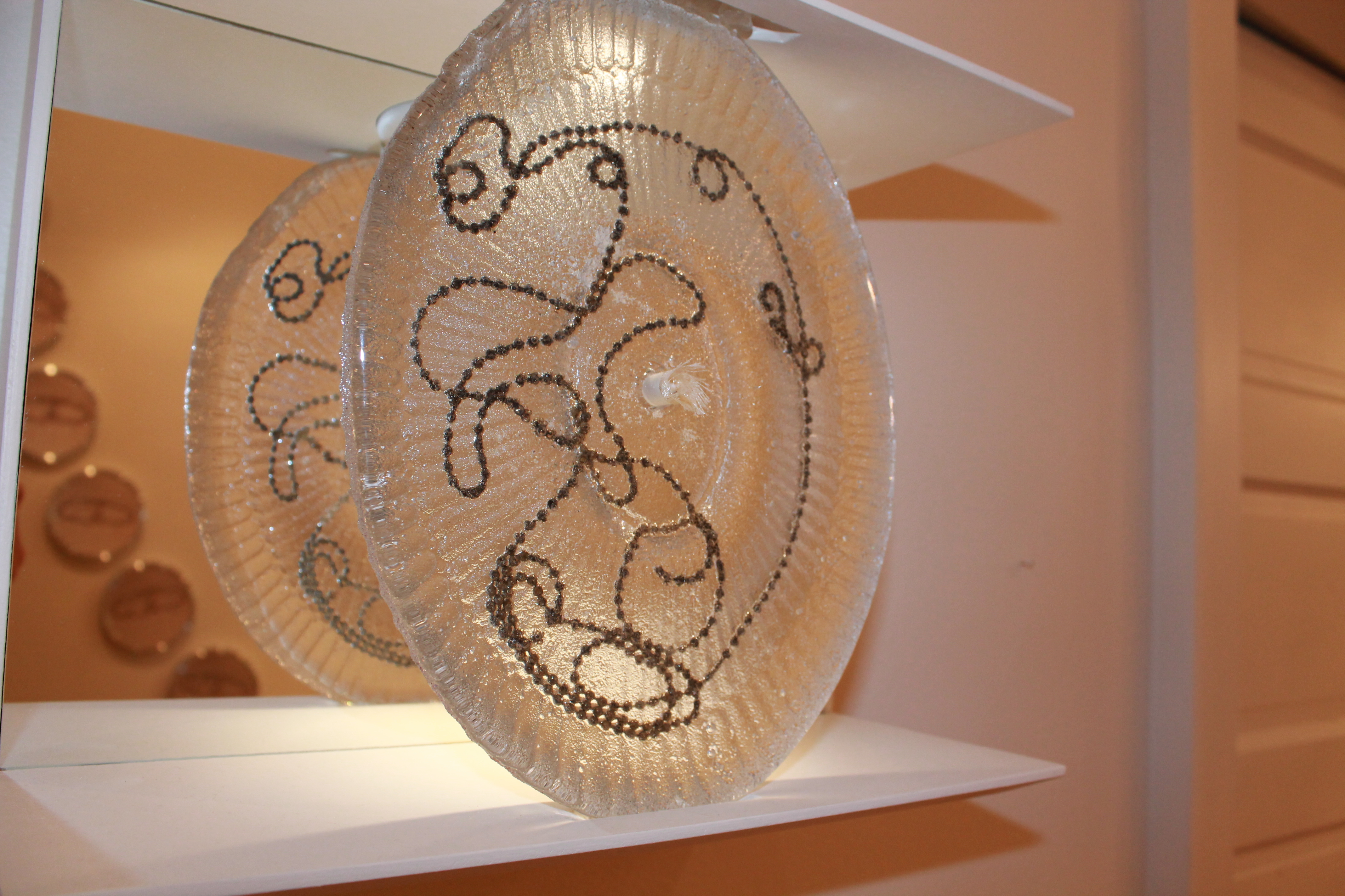 A part of the work worthy of attention is the Trace/Trail series of sand-cast glass sculptures with beaded steel chain embedded beneath the surface. These oval shaped pieces gracefully stand in mirrored wall mounts. The side facing the viewer is smooth yet the lighting allows us to see the incredible texture, bubbles, and movement of the chain inside the glass. Defying gravity, they seem to float in the light.