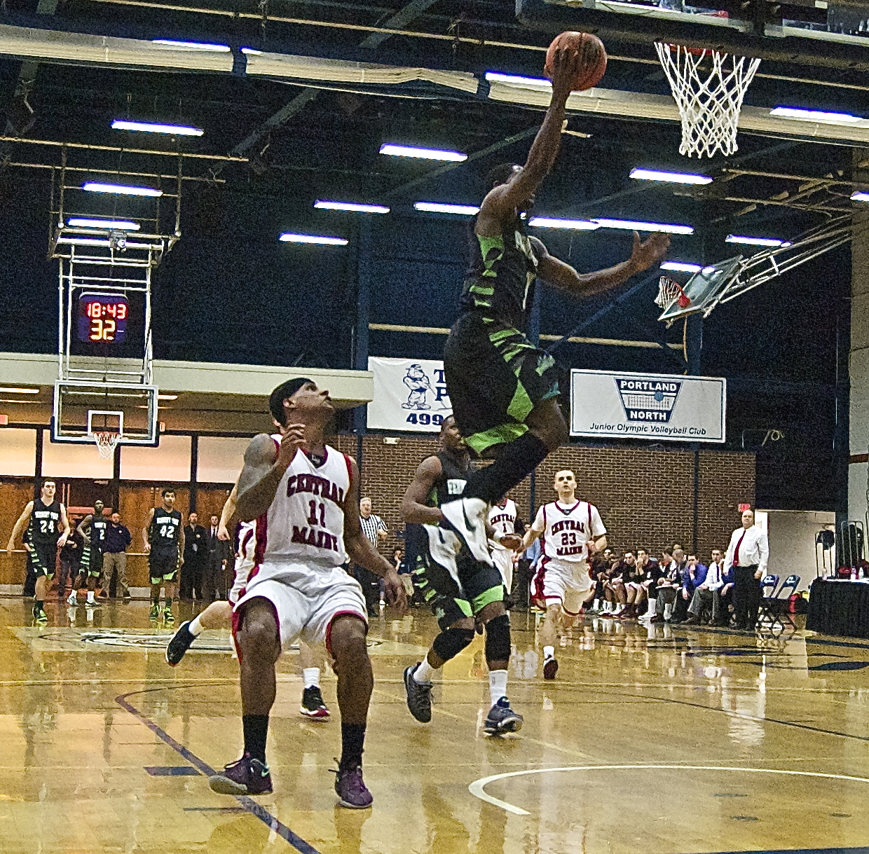 Jamal Hughes of Vermont Tech ties the game at 42 in the beginning minutes of the 2nd half as Luis Medina watches the play transpire to its end. Kamal Hughes drained 29pts and grabbed 9 rebounds in an exciting game that didn’t see CMCC pull away until the late stages of the game.