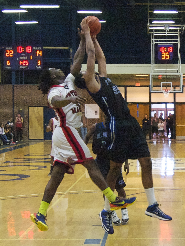 Big men Kazre Cummings of CMCC and Michael Bowlers of St. Joe’s fight for a rebound in the first half of the YSCC Elite 8 Championship game. The Mustangs walked away with a 90 – 68 victory earning an automatic bid to the USCAA National Finals in Uniontown, PA.