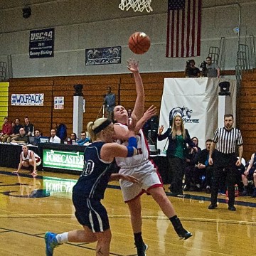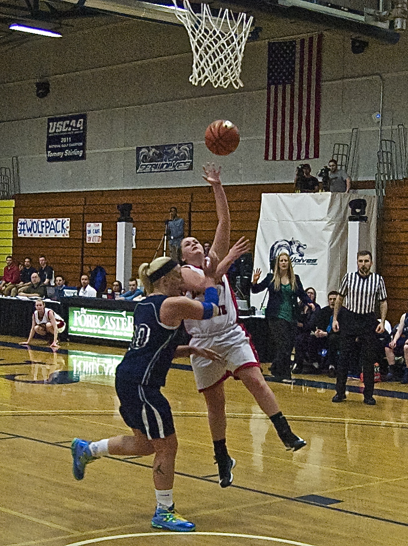 Hannah Champagne drives for a layout over U Maine – Augusta’s Jennifer Lola in the YSCC Women’s Elite 8 final. Hannah Champagne finished the contest with 3pts, 3assists and 2 steals.
