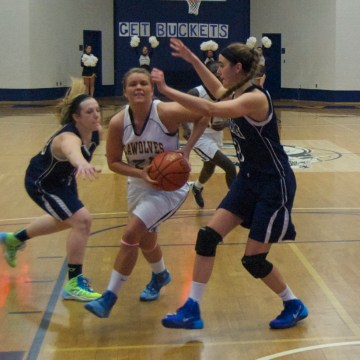 Danielle McCusker finds the path to the basket tough going as Jamie Plummer and another U Maine Augusta defender hinder her path. Danielle McCusker would end the game with 17pts and 5 rebounds.