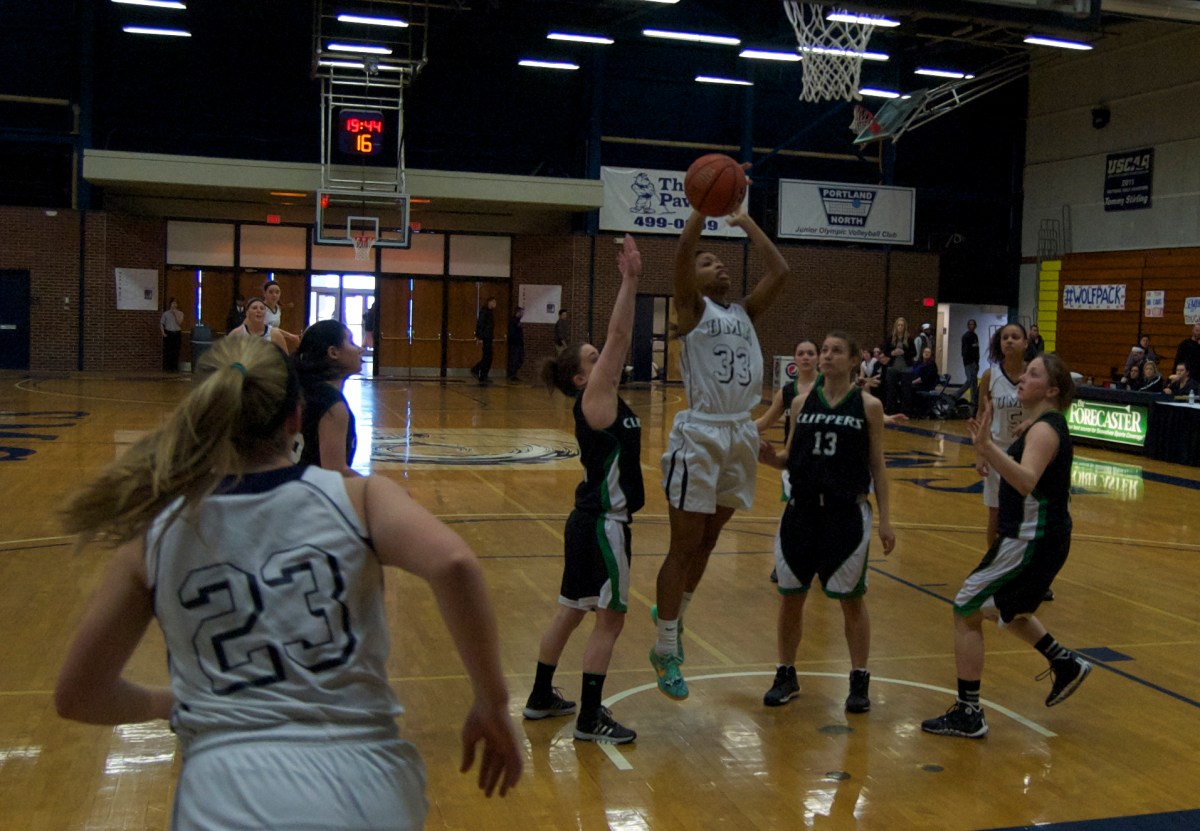 Arreonte Lee of U Maine Augusta splits the defense on the inbound pass in the first half of quarter final action against the Clippers of U Maine Machias. Arreonte would contribute 13pts and 8 rebounds in the win over Machias.