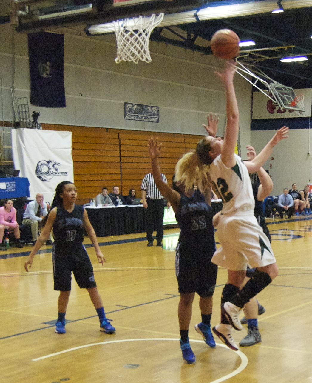 Vermont Tech’s Alyssa Cassanelli starts and finishes a reverse layup against St Joe’s Shalonica Speicht. Vermont Tech would finish St. Joe’s off 71-54, advancing to the semi-finals facing CMCC.
