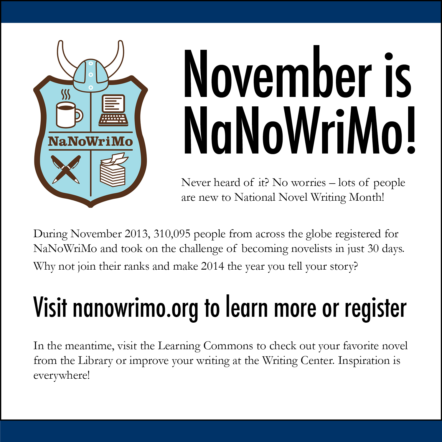 Uncategorized NaNoWriMo Month By The SMCC Beacon on November 3, 2014 • ( Leave a comment ) Share this: Click to share on X (Opens in new window) X Click to share on Facebook (Opens in new window) Facebook Like Loading... Related Categories: Uncategorized