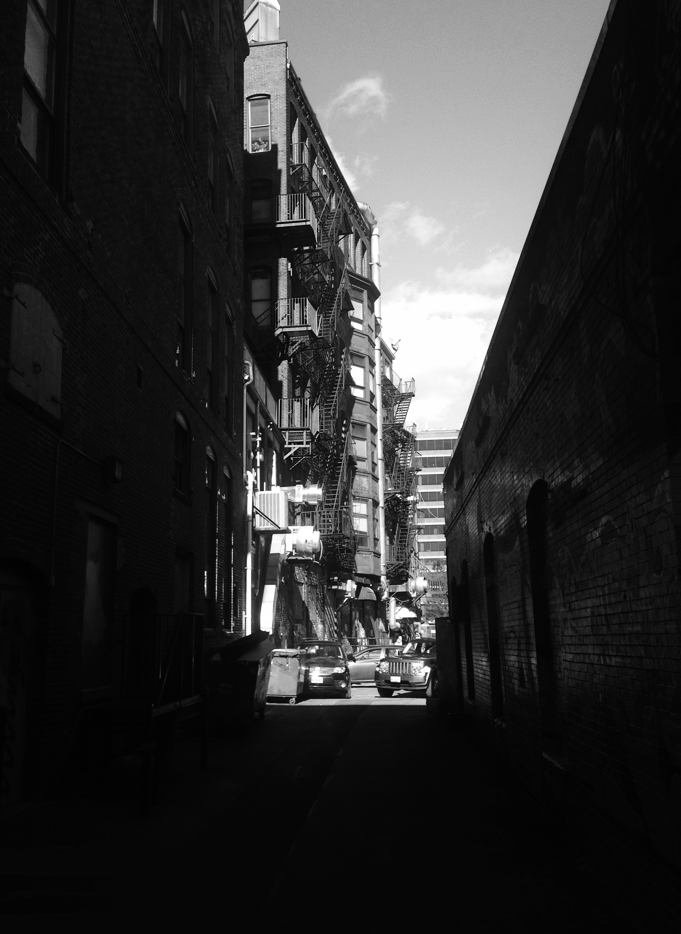 The distinct contrast between the two sections of buildings gives the appearance of a window leading to a more intricate cityscape. The composition heavily relies on vertical and horizontal lines, but the one diagonal line from the top right corner to the central light area provides a smooth transition from the sections. Light is a heavy motif in this photograph and becomes the main focus because all of the intricacy occurs in the light area. This does not mean that the dark foreground does not have interest, instead it provides a simpler solution to the question of light; in this scenario elimination is an elegant describer.