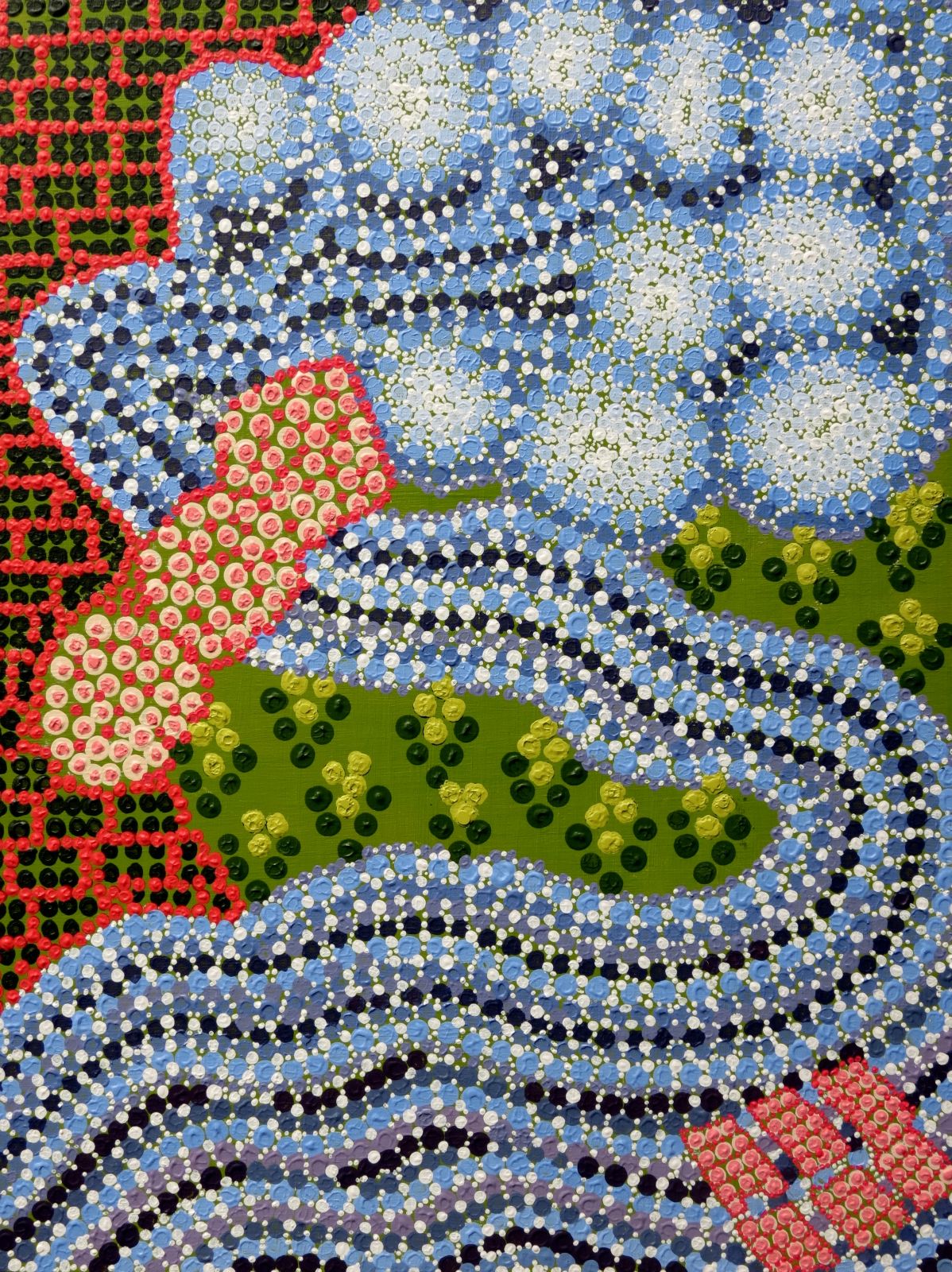 In their paintings, students were asked to create an aerial map of a real or imagined place, inventing symbols to mark significant spots. The “dot” style is typical of contemporary aboriginal work.