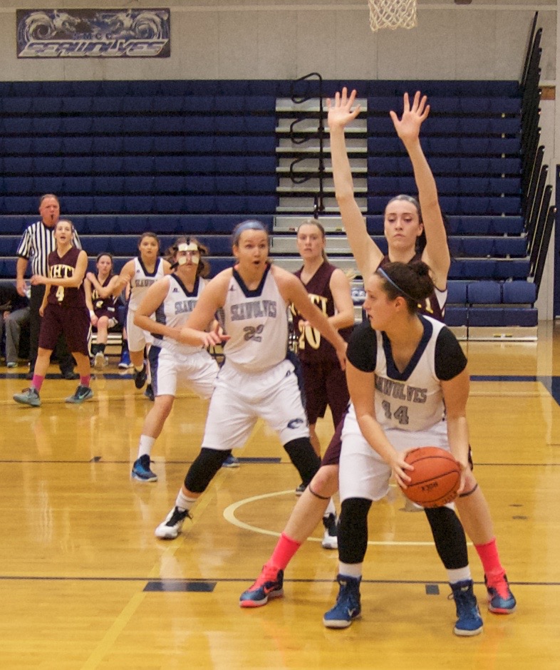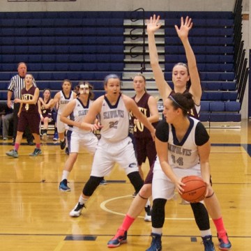 Alicia Hoyt looks for breathing room against NHTI. Alicia is averaging 11.3 points per game and has grabbed 107 rebounds to date, averaging 8.2 boards.