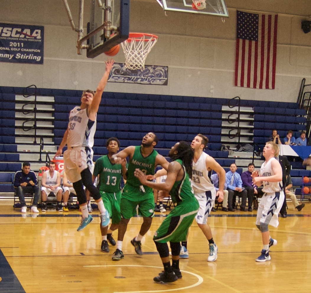 Ville Wuorenjuuri finishes off underneath while UM-Machias defenders watch. Ville is shooting 41.4 percent from three-point land while dishing out 40 assists to date in all games.