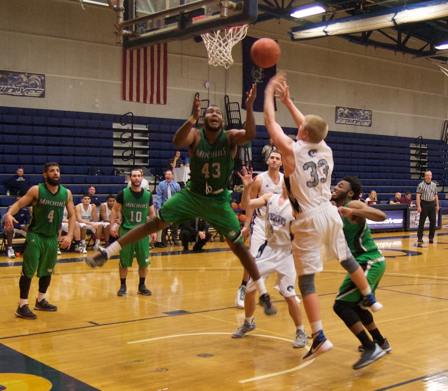Zaire Wilson goes strong to the hoop against NHTI. Zaire is averaging 5.3 points per game and grabbing 3.1 rebounds as a reserve and is a force to be reckoned with under the boards.