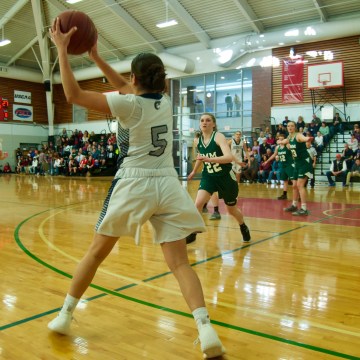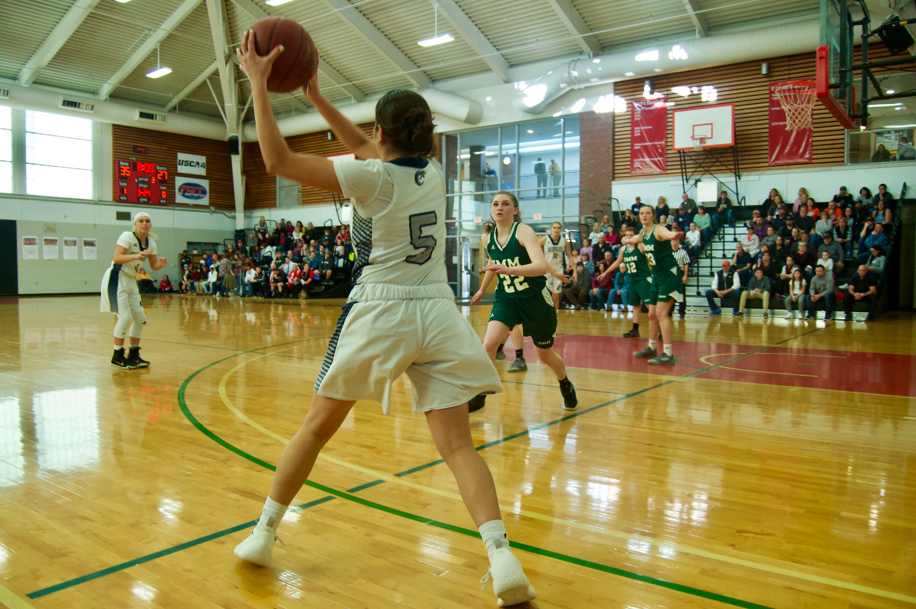 Perscila Berdeja readys a pass to Emily Hogan in second half action against U Maine-Machias. Berdeja would hit for 15pts against U Maine-Machias