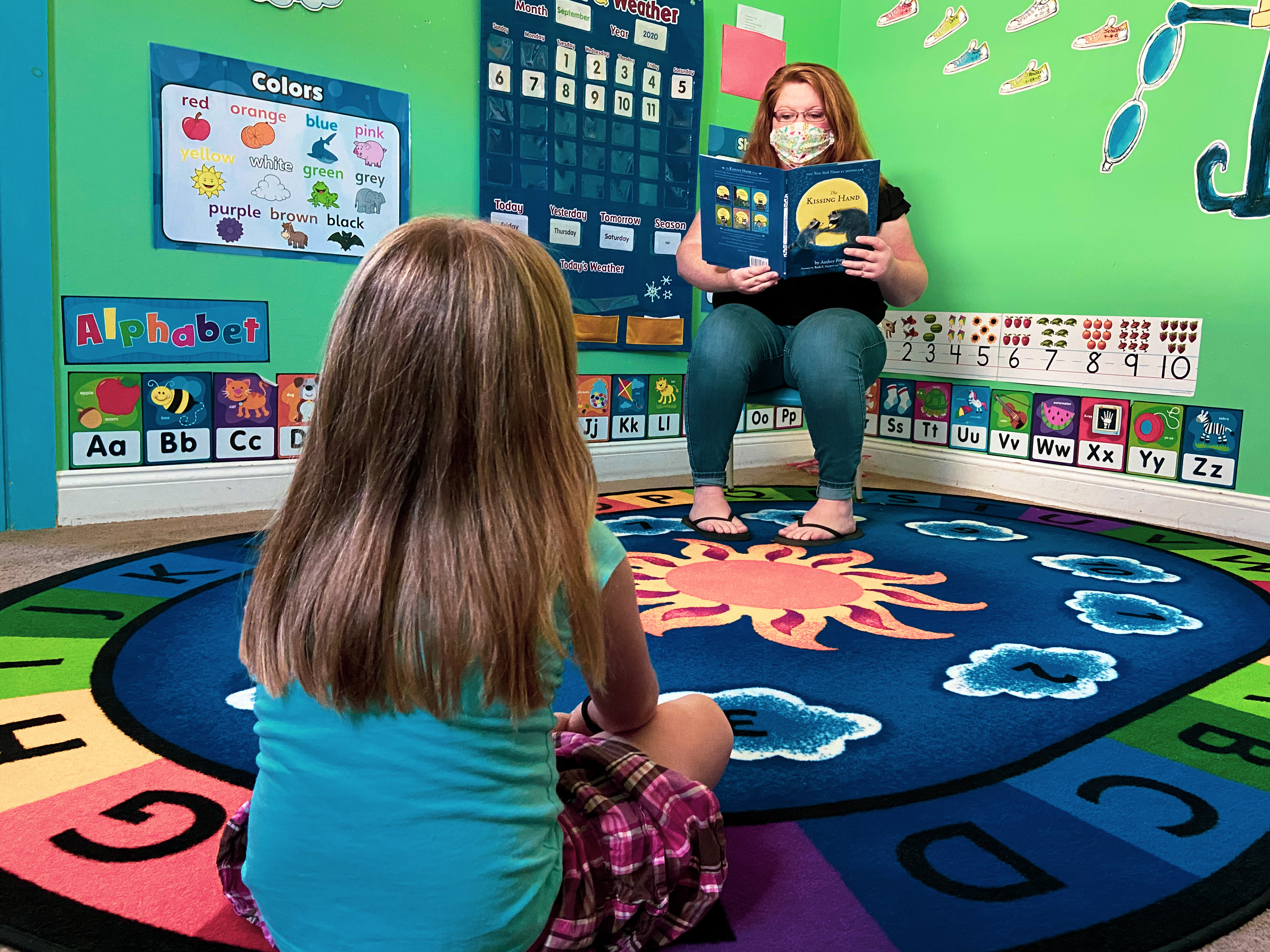 Photo taken by Samantha Jacobs, showing how Jenny, preschool teacher, practices COVID protocols, six feet apart and wearing masks.