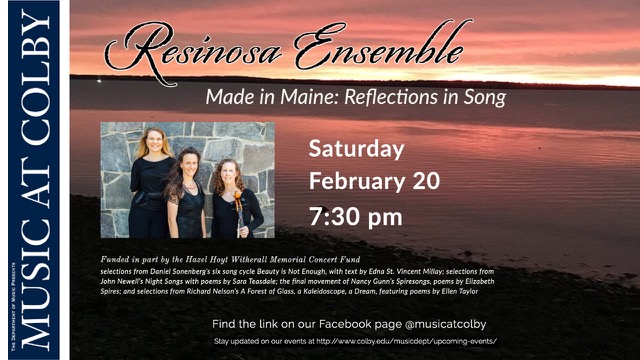 This recital, specially curated for Colby’s Music in the Museum concert series, features carefully chosen songs from Resinosa’s commissioned premieres. The Resinosa Ensemble is a chamber trio formed in 2016 featuring Joëlle Morris, mezzo-soprano; Bridget Convey, piano; and Eliza Meyer, cello.
