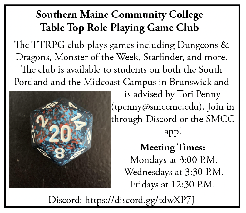 Campus News SMCC Table Top Role Playing Game Club By Anthony Gendron on March 31, 2022 • ( Leave a comment ) Discord Link: https://discord.gg/tdwXP7J Share this: Click to share on X (Opens in new window) X Click to share on Facebook (Opens in new window) Facebook Like Loading... Related Categories: Campus News