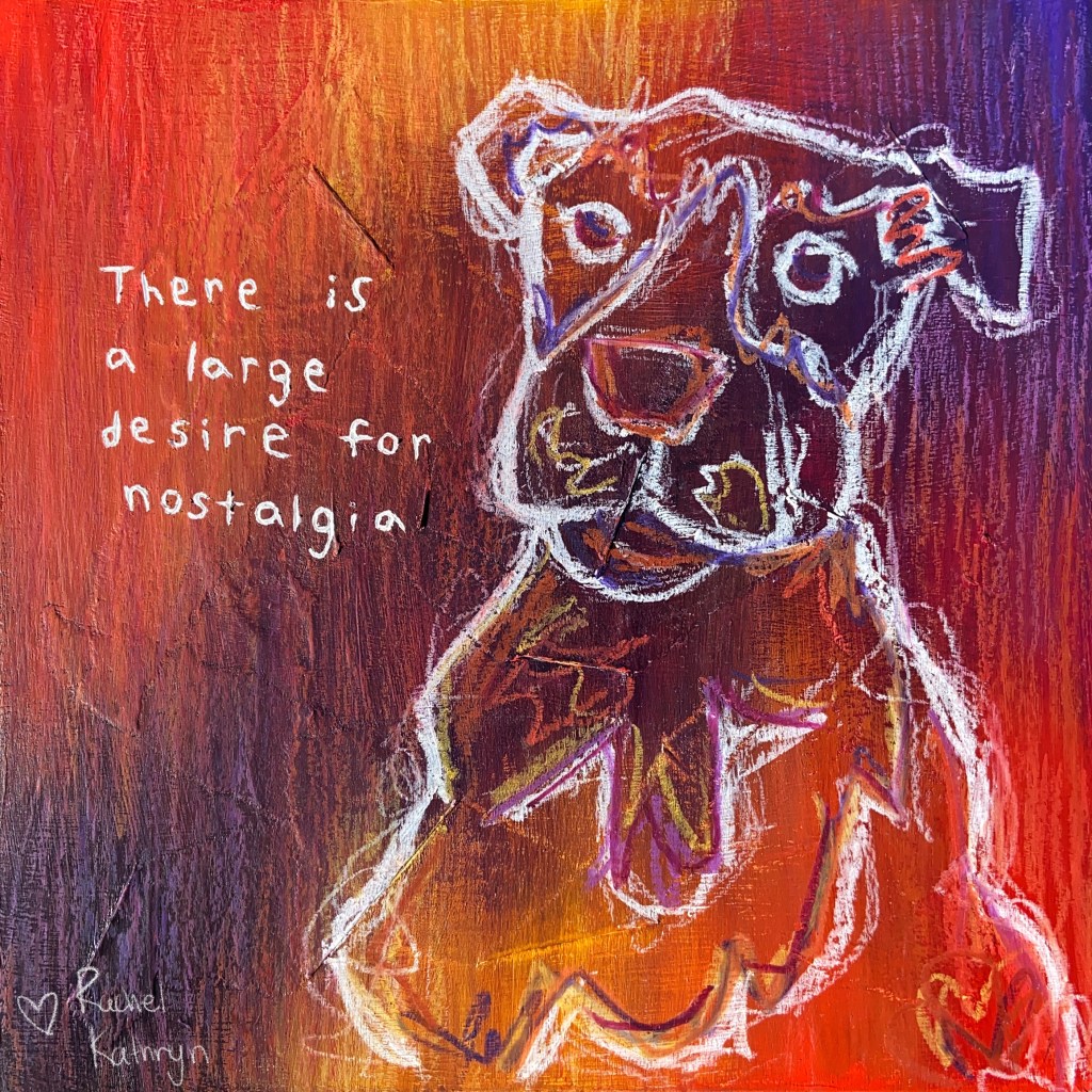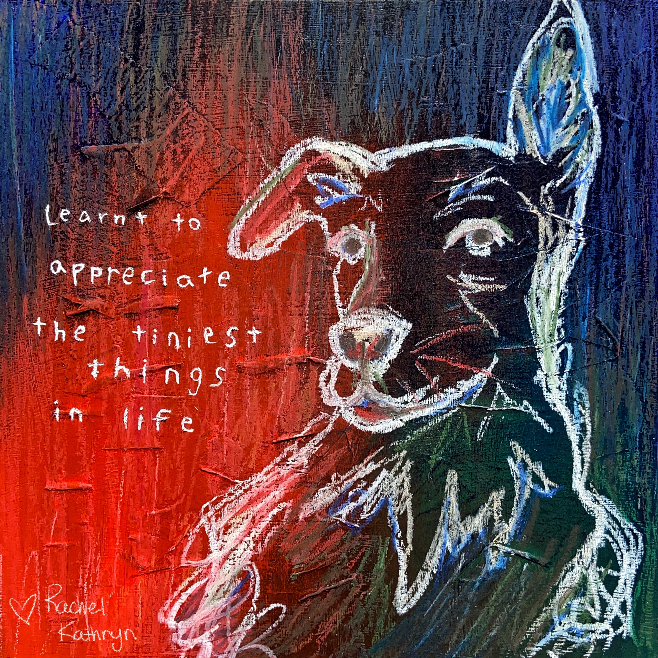 “These three pieces are part of a series I did back when the COVID-19 pandemic first started. I was spending a lot of time around animals instead of people, and they became my biggest inspiration. I used their portraits alongside anonymous quotes from my peers to demonstrate how individuals were feeling/coping with the pandemic, and how we as people became strangers to one another. I experimented with lots of different media, but in the end the best way I found to portray chaos and hyper-emotion was through paper mâché, acrylic paint, and oil pastels. I created texture on the wood panel with the paper mâché, and then used both wet and dry brush techniques with the acrylic paint. I then used oil pastels to draw the figures, without having an initial sketch in fact. This was challenging, but I like how it creates energy and expression within the figure. The last step was carving the text out of the material build up on the panel, which was then thinly cased by white paint”- Rachel Kathryn