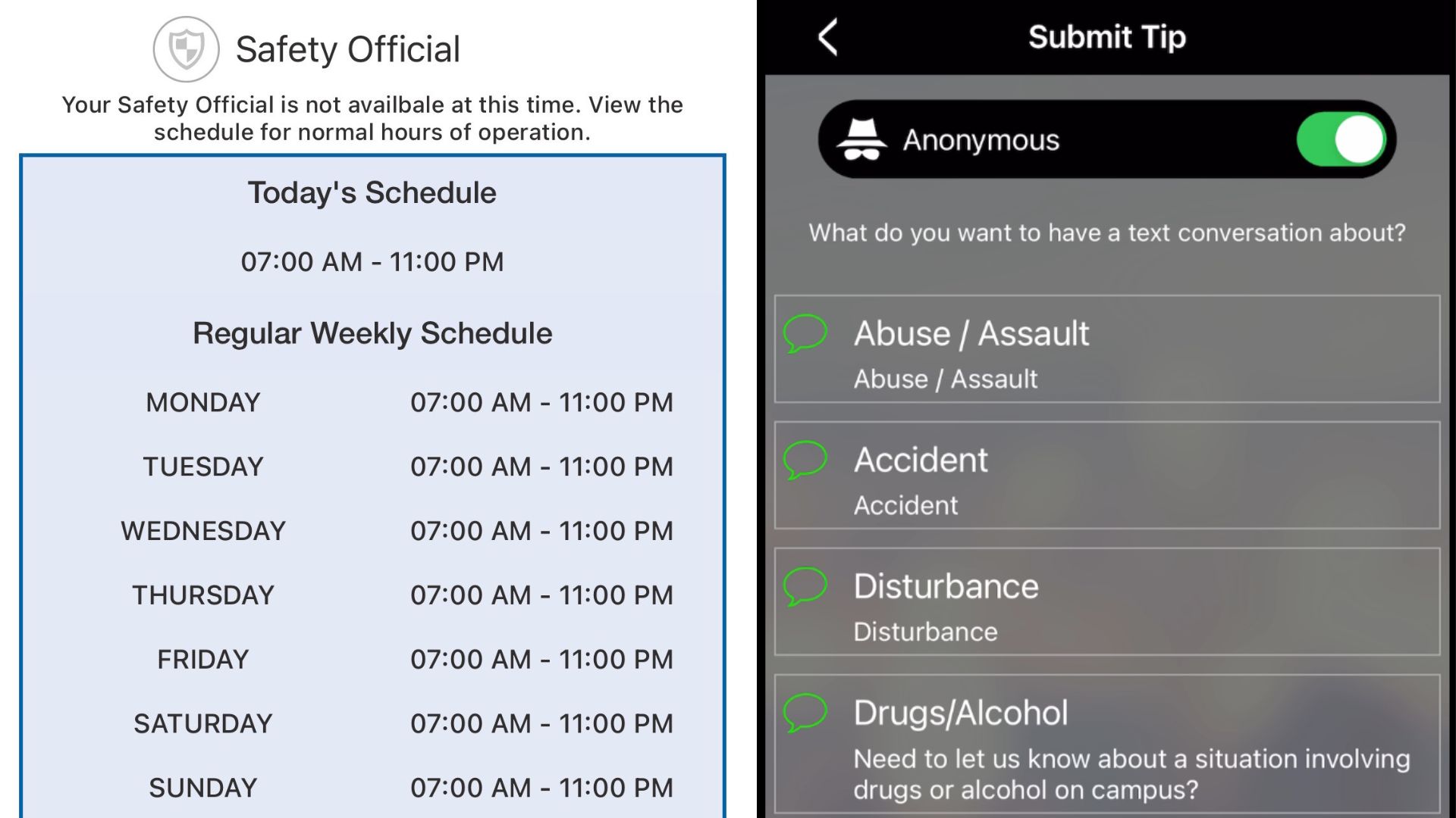 Another great feature the app offers is the ability to send a tip anonymously–meaning students can be connected to security officers in real-time and get answers to their concerns without worrying about personal privacy or repercussions from reporting.