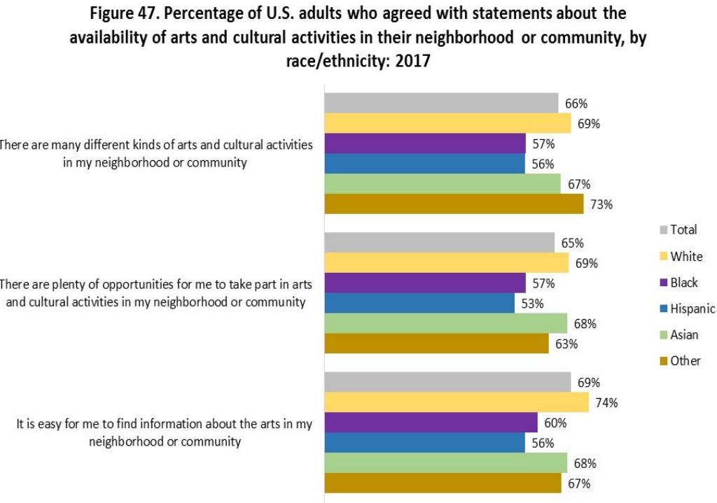 However, the most troubling statistic comes from a racial/ethnic breakdown in the survey. When participants were asked if they felt as though they had opportunities to engage with the arts, far less black and Hispanic people surveyed answered yes (see right figure).
