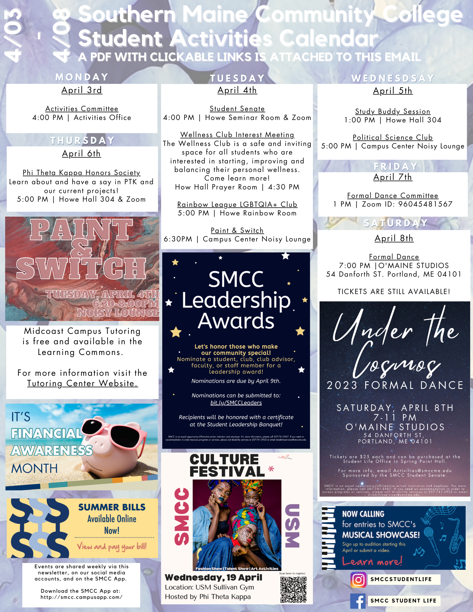 Calendar Events this week: Wellness Club, Paint & Switch, Formal Dance & More! By The SMCC Beacon on April 3, 2023 • ( Leave a comment ) Share this: Click to share on X (Opens in new window) X Click to share on Facebook (Opens in new window) Facebook Like Loading... Related Categories: Calendar, Campus News