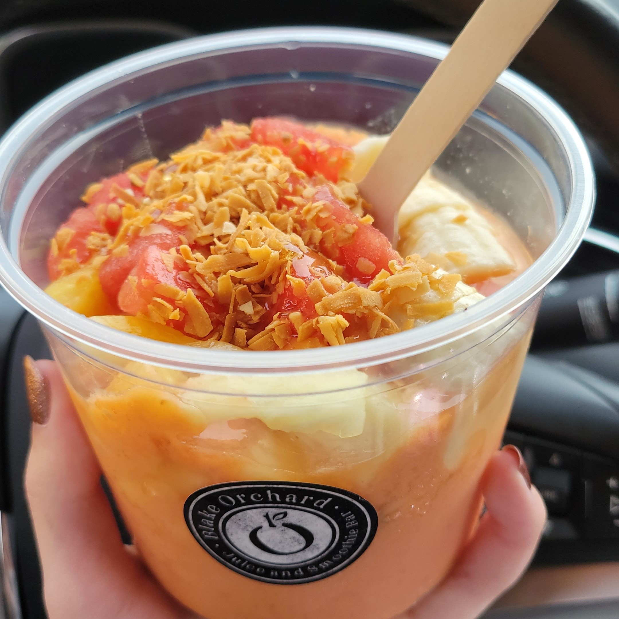 In my first experience at Blake Orchard, I tried the ‘Summer Bowl’ for $14.50; which I’d describe as having a sweet, strawberry/apple/blueberry tasting base. I was surprised to see that it had so many toppings to pair with the bowl, such as fresh strawberries, pineapple, bee pollen, shredded coconut and honey for the base order. On top of this, you can add any of their toppings for an extra charge of $1-2. Not one of their ingredients taste artificial in any way, and the open kitchen shows that they truly do make all of their products to order. Each time I have picked up an order at the estimated time, which typically has a ready time of 10-15 minutes, my food has been ready to go without issue.