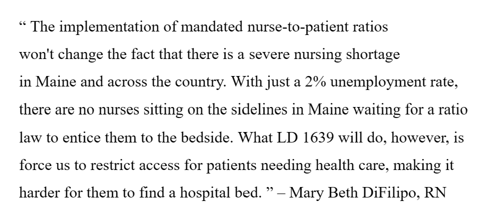 Kevin Carelton, former Western-Maine Healthcare board member, continues McRae and DiFilipo’s sentiment: in an article, Carelton wrote: “The bill would put the exact number of nurses required to staff hospital units, regardless of patient acuity, nurse experience, or any of the other factors our nurse leaders use to decide how to provide excellent patient care”.