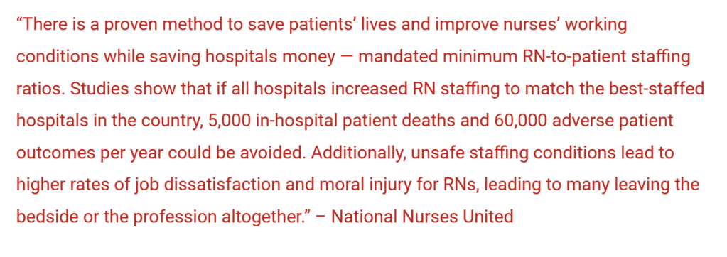 Research would, in fact, support the idea that mandated ratios benefit both the nurse and patient: according to Karen Rosenberg’s 2021 study, “minimum nurse-to-patient staffing ratios not only improve nurse staffing and patient outcomes, but also yield a good return on investment. Staffing improvements of one fewer patient per nurse led to improvements in mortality, readmissions, and length of stay.”